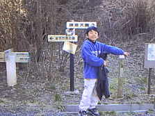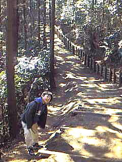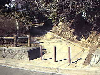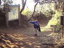 | ここが、入り口。住宅街の中にあります。非常に分かりずらいのですが、能見台南小学校の校門からまっすぐ100m行ったところにあります。小学校を目安にさがし探してください。 写真のような未舗装の細い道が続いています。2000年の3月に、階段や崩れそうな場所の改修をしましたので、非常に歩きやすくなっています。 ここで2時15分です。はたして明るいうちに鎌倉海岸につくのでしょうか?ちょっと心配ですが、おさるクンには内緒にしておきましょう。 |