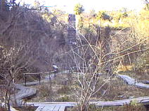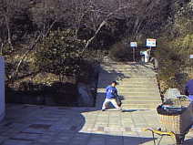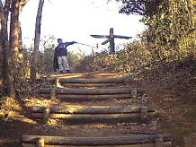 | この階段が、散策路の入り口です。間違えないように。ここさえクリアーしてしまえば、あとは、ほぼ一本道です。 この道は、面白自然ルートの一部になっていて、どんぐりの森や虫の国など、楽しい散歩コースになります。 おさるは、まだ元気いっぱいで走りまわっています。 |