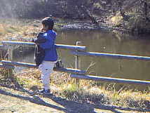 | ここがひょうたん池です。能見台入り口からちょうど1時間でした。 ひょうたん池から鎌倉天園までの直通の道は、現在通行禁止なので、ちょっと迂回してゆきます。右に曲がって市民の森のほうへ行きます。 そろそろ、おさるに疲れが見え初めてきました。後どのくらいで付くのか?としきりに聞いてきます。 |