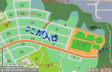 | 金沢八景海の公園から一時間ほどで、能見台6丁目に到着します。ここまでの道順は少し複雑で、ここでは説明しきれません。お手数ですが、地図を見ながら歩いてみてください。一般道ですので、車に気をつけてください。 下の地図のポイントから、金沢自然散策路が始まっています。自然散策路は、いろいろな入り口がありますが、海から一番近いのはこの能見台入り口だと思います。 |