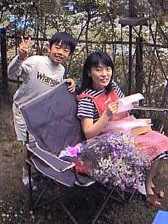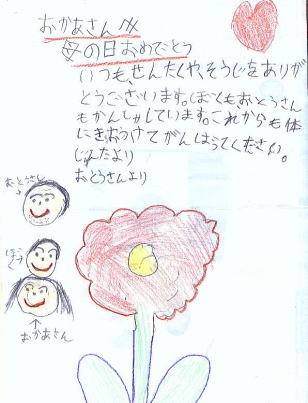 おかあさんにプレゼントをあげたよ。エプロンのプレゼントはぼくが買ったよ。お花はお父さんが買ったよ。