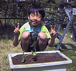 | こんなにのびたのに、まだ実ができません。それと長いのと、みじかいのがあります。水あげは、ぜんぶおかあさんがやりました。もう、つぎのかんさつのものは買ってくれないといわれました。 みを作るのは、むずかしいと思いました。 |