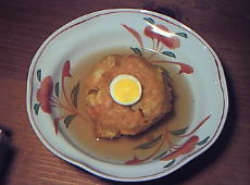 | うずらの卵をお月さんに見立てた月見まんじゅうです。ちょっと手の込んだ感じのお料理なので、かぼちゃだけで作って「かぼちゃの宝来揚げ」として、お客様にお出しすることもあります。 |