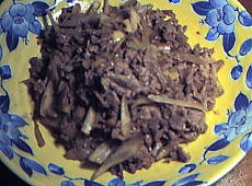 - 2に牛肉を入れて、色が変わるまでさらに炒める。そこへ紹興酒、中国しょうゆ、砂糖を加えて汁気がなくなるまで炒る。最後に、白ごまをふりかける。