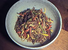 | チャプチェとは、聞きなれない名前ですが韓国の野菜炒めあえです。本来は、お肉はもっと少ないのですが、おかずにもなるように多めに入れています。材料ひとつひとつを刻んだり、炒めたり、ずいぶん手のかかるお料理ですがとっても美味しいのでぜひ試してみてください。チャプチェファンになることと思います。 |