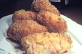 - 3が冷めたら、12等分にし、平たくまとめる。小麦粉、溶き玉子、パン粉の順につけ、中温の油でキツネ色に揚げる。