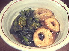 | 車麩を揚げてから煮ると、もちっとした食感がおいしいです。この手のお料理は、だしが決め手なので、昆布と鰹節でていねいにとってください。 |