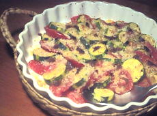 | トマトとズッキーニをこんな風にして食べると、ほんとに美味しい!!出会いの味というのでしょうか。パン粉が野菜の汁気を吸って、カリッと香ばしく仕上がります。 |