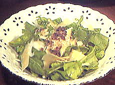 | ルッコラは、このところよく見かけるようになりました。かむと、ほろ苦くって、ごまの味がします。このサラダは、どれが欠けても美味しくありません(ちょっと、おおげさか?!) |
