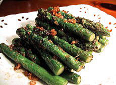| 何度もいうようですが、私はアスパラが大好き。野菜コーナーの5ページにもアスパラのソテーを載せてますが(こちらは、パルミジャーノ添えです)、アスパラは、こんな風にシンプルな食べ方が一番です。国産のアスパラは、初夏に出回るので季節を感じる野菜です。 |