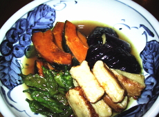 かぼちゃ 1/4個 なす 2本 しし唐 1パック あわ麩 1本(130g) A {だし汁 2カップ、薄口しょうゆ 大さじ1、みりん 小さじ2、 塩 小さじ1/2 } 揚げ油 適宜 |
