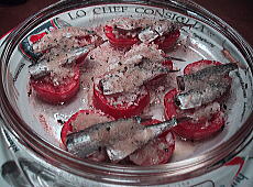 - 耐熱皿に薄くオリーブ油(分量外)を塗り、1のトマトを2個づつ並べる。その上に、玉ねぎをたっぷり載せ、さらにオイルサーディンを2切れづつのせる。そして、2をのせ、オリーブ油を上からかける。