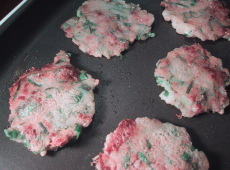 - 大きめのボウルに1、2、3を混ぜ合わせる。180℃にセットしたホットプレートにごま油(分量外)をぬり、タネを7〜8cmくらいの円になるように広げて、両面をこんがりと焼く。