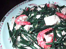 - 中華鍋を熱して、ごま油を入れ、長ネギ、花ニラを加えてさっと炒める。花ニラは取り出しておく。そこへ、水と塩を入れて煮立て、豆腐、海老を入れてしばらく煮る。