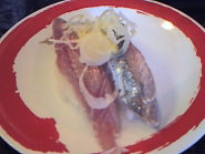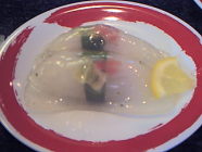 | 上の左はイカの上に、アロエのゼリーをのせたものです。この他にもいろいろなネタにアロエのゼリーがのっています。食感は、ニュリュニュリュです。 どうですか、こんなの見たことあります?珍しいでしょ!(^0_0^) おいしいかって?私は無い方がいいと思います。 |