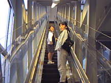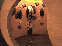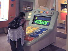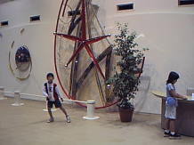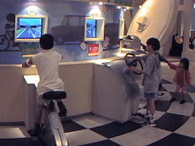 | このへんのゲームは、本当によくできています。ブロッターという空を飛ぶ自転車に乗って、自然からもらえるエネルギー源を探しにゆきます。右手に握っているバーでねらいをつけて、エネルギーを獲得するのですが、絵もきれいで勉強になります。普通このような機械の前は、子供が列を作って並んでいますが、ここは空いているので、一人で何回もできます。ありがたいことです。 |